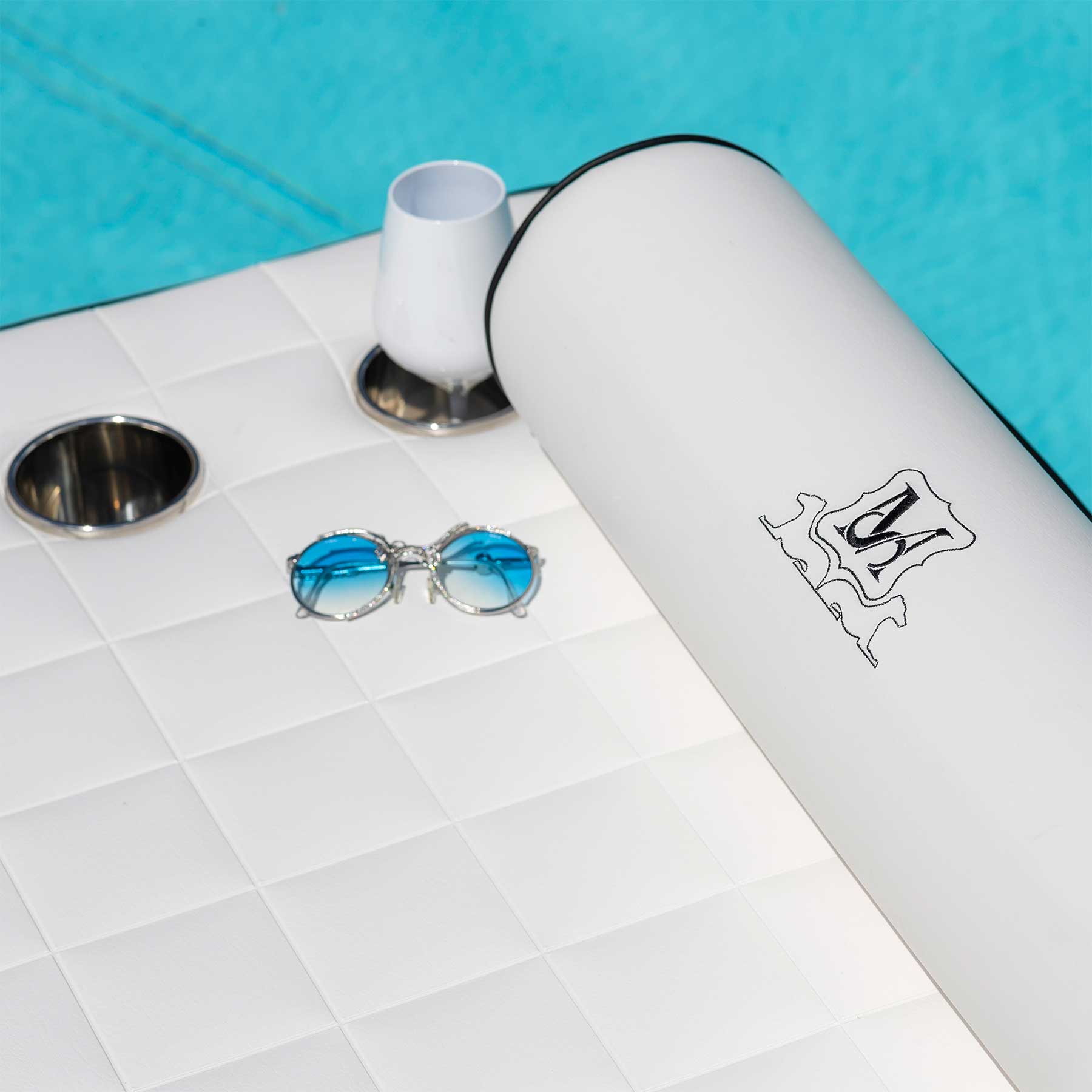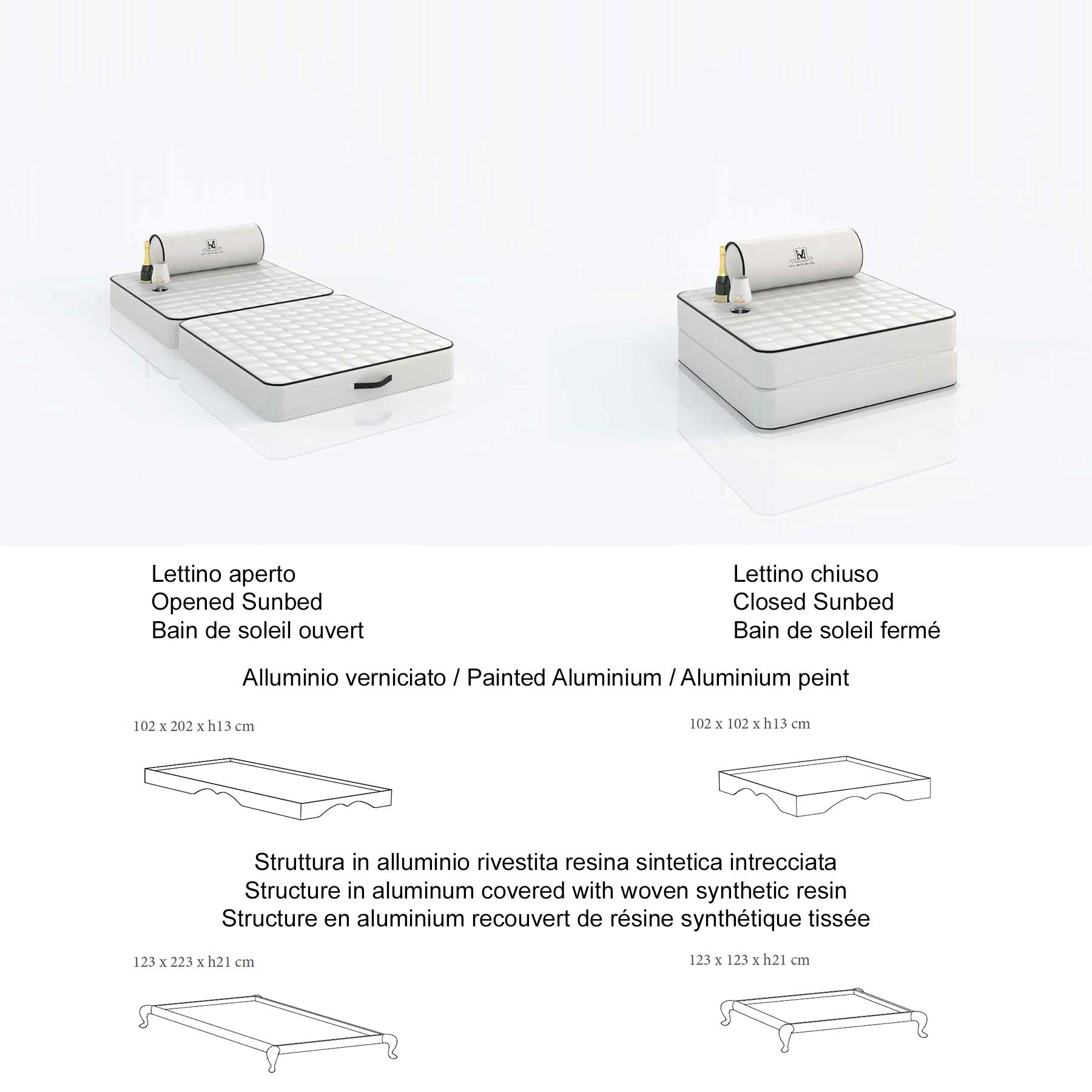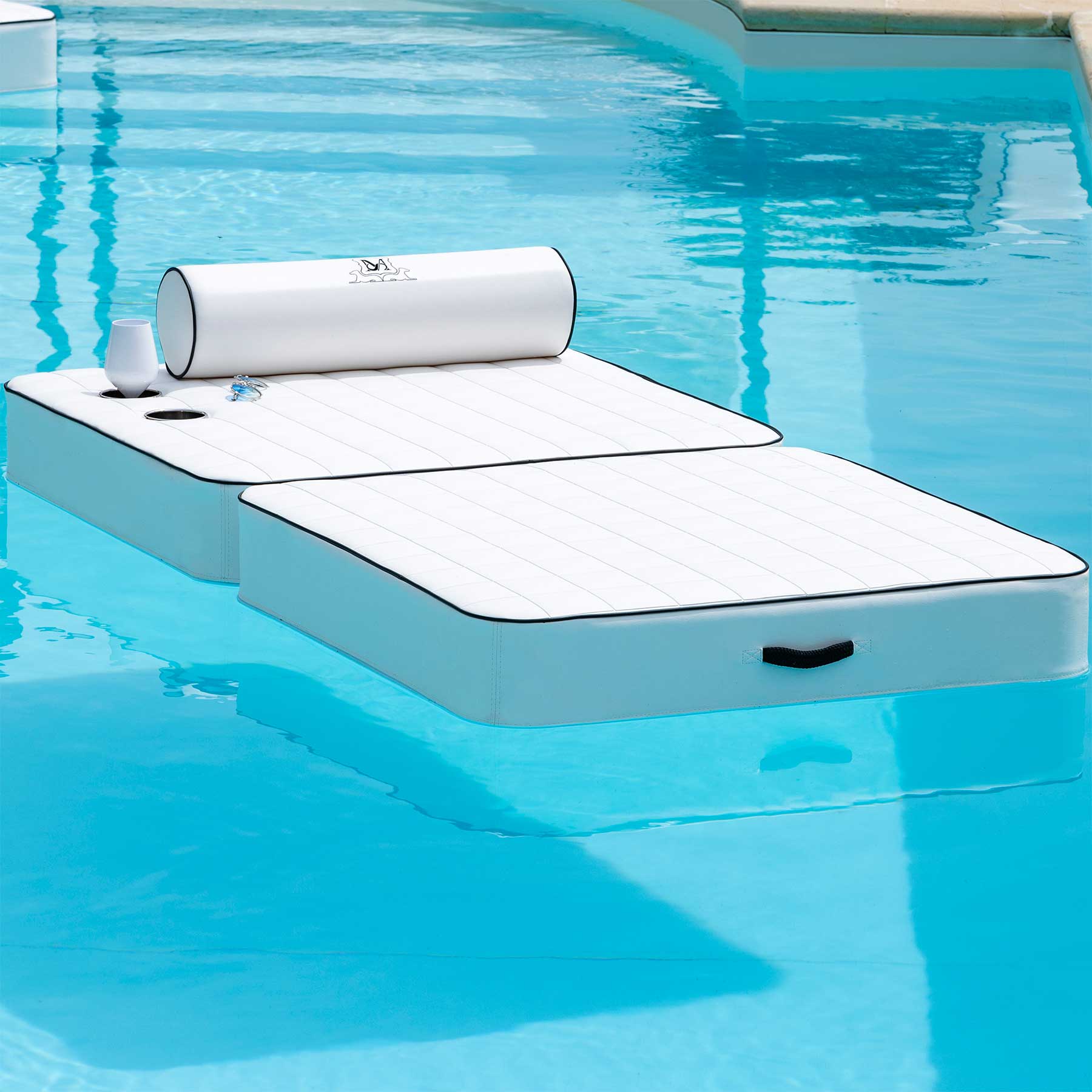 Su richiesta, ogni elemento della collezione è dotato di un’elegante base in alluminio su cui il cliente può appoggiarlo quando viene tirato fuori dall’acqua, in modo che lo stesso elemento può essere utilizzato anche per prendere il sole, diventando a tutti gli effetti un lettino o una comoda poltrona a bordo piscina.