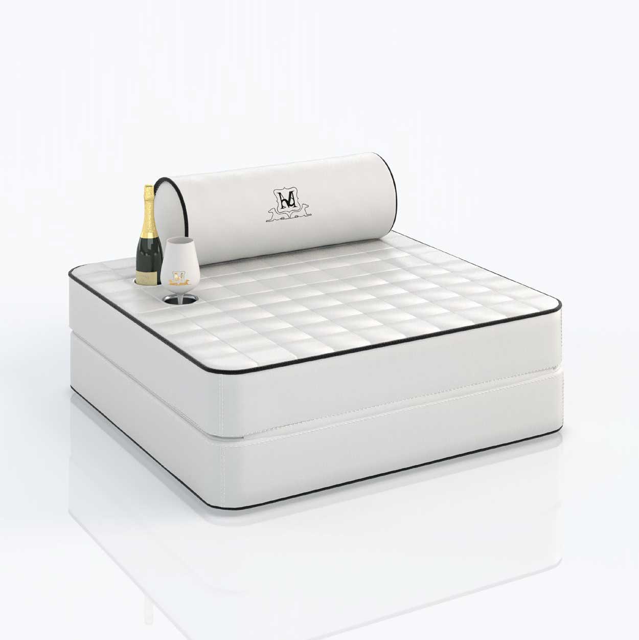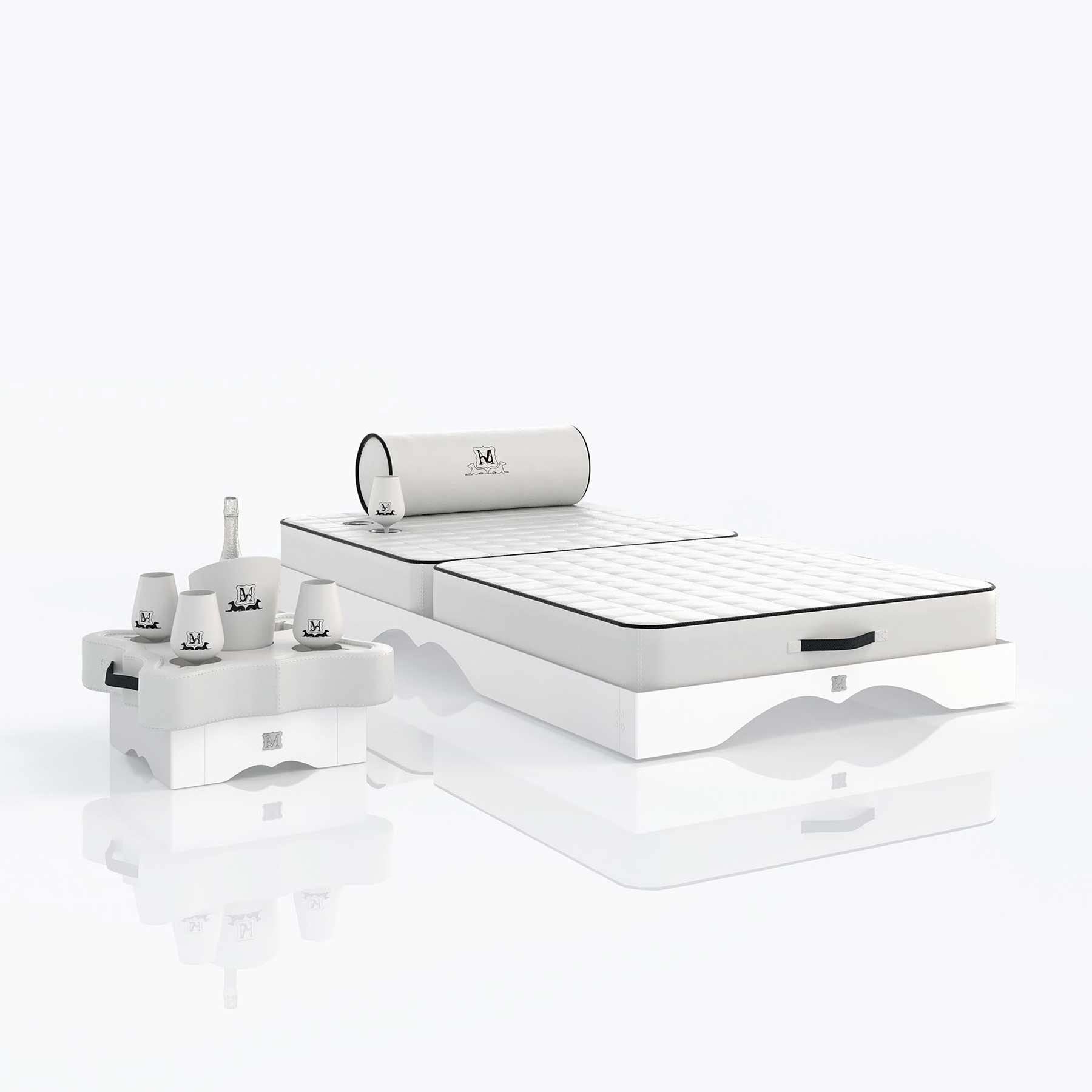 Il lettino prendisole galleggiante Canopo è realizzato in eco pelle bianca con finitura matelassé elettro saldata.