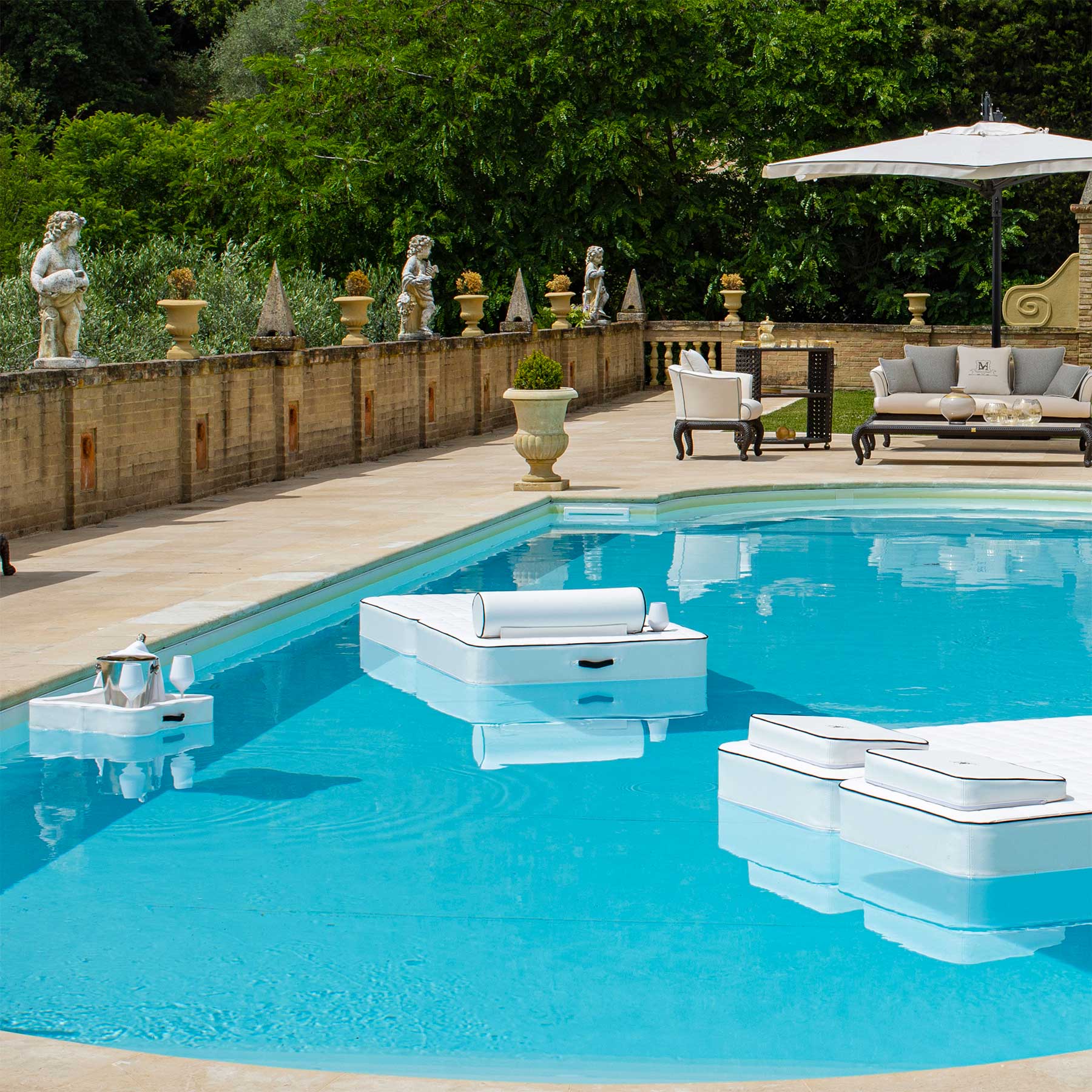 Per tutte le personalizzazioni di colore e per gli accessori quali le basi in alluminio, i teli di copertura protettivi su misura o il porta bicchieri e secchiello galleggiante visibile nelle foto, siamo a disposizione telefonicamente al n. +393477960415 o via e-mail all’indirizzo info@italydreamdesign.com