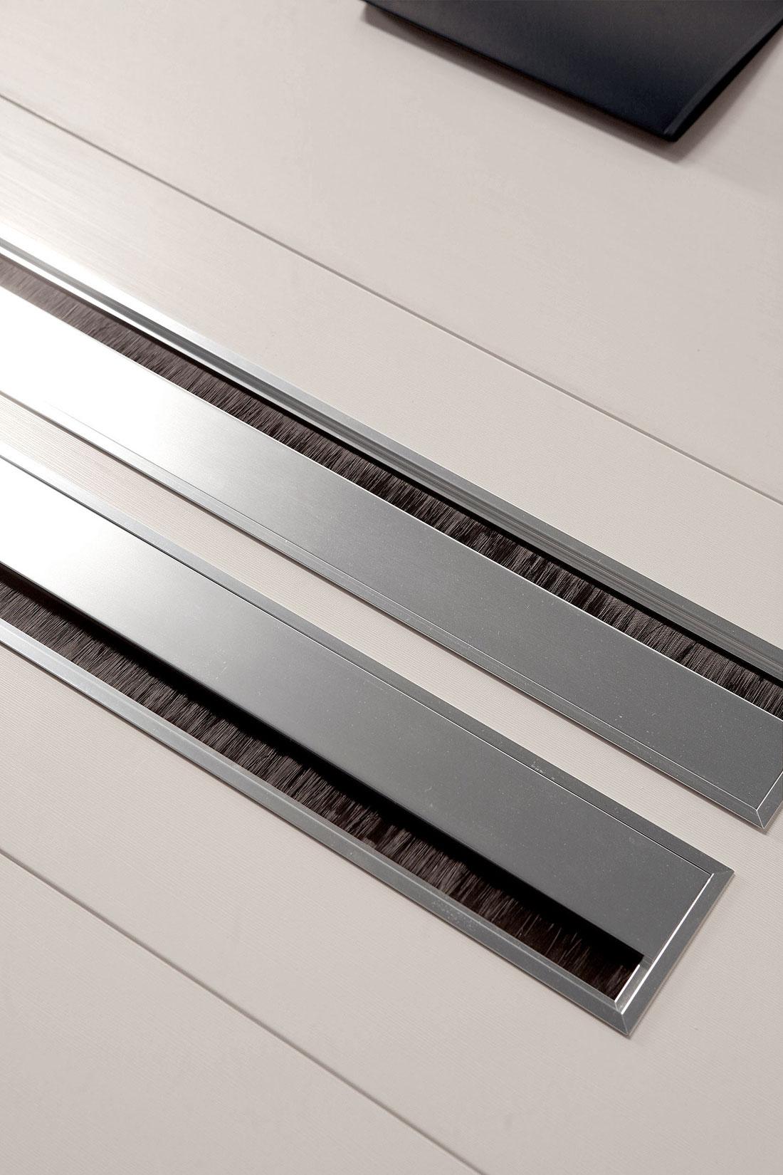 Il top access è in alluminio estruso anodizzato effetto cromo lucido satinato, dotato di sportellino con apertura a ribalta per l’accesso al sottostante vano wire management anch’esso in noce oltre all’apertura passacavi lineari con spazzolino para polvere nero.