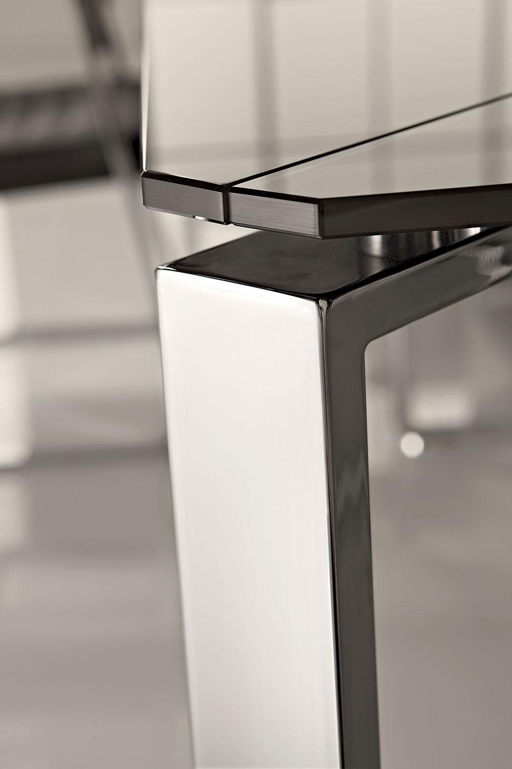 Il piano è in cristallo nero temperato di spessore 12 mm retro laccato a filo lucido con angoli smussati.