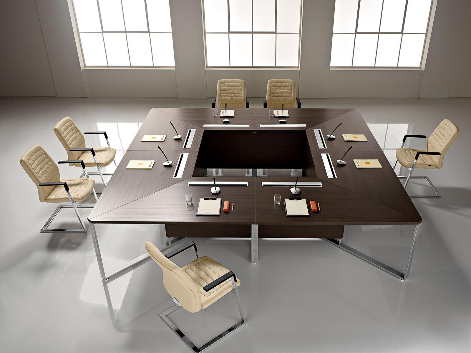Le gambe terminali e centrali sono combinabili fra loro e consentono l’aggregazione di vari moduli idonei a configurare molteplici tipologie di tavoli di forma quadrata o rettangolare che ne consentono l’utilizzo in sale di piccola e media riunione cosi per grandi sale consiliari.