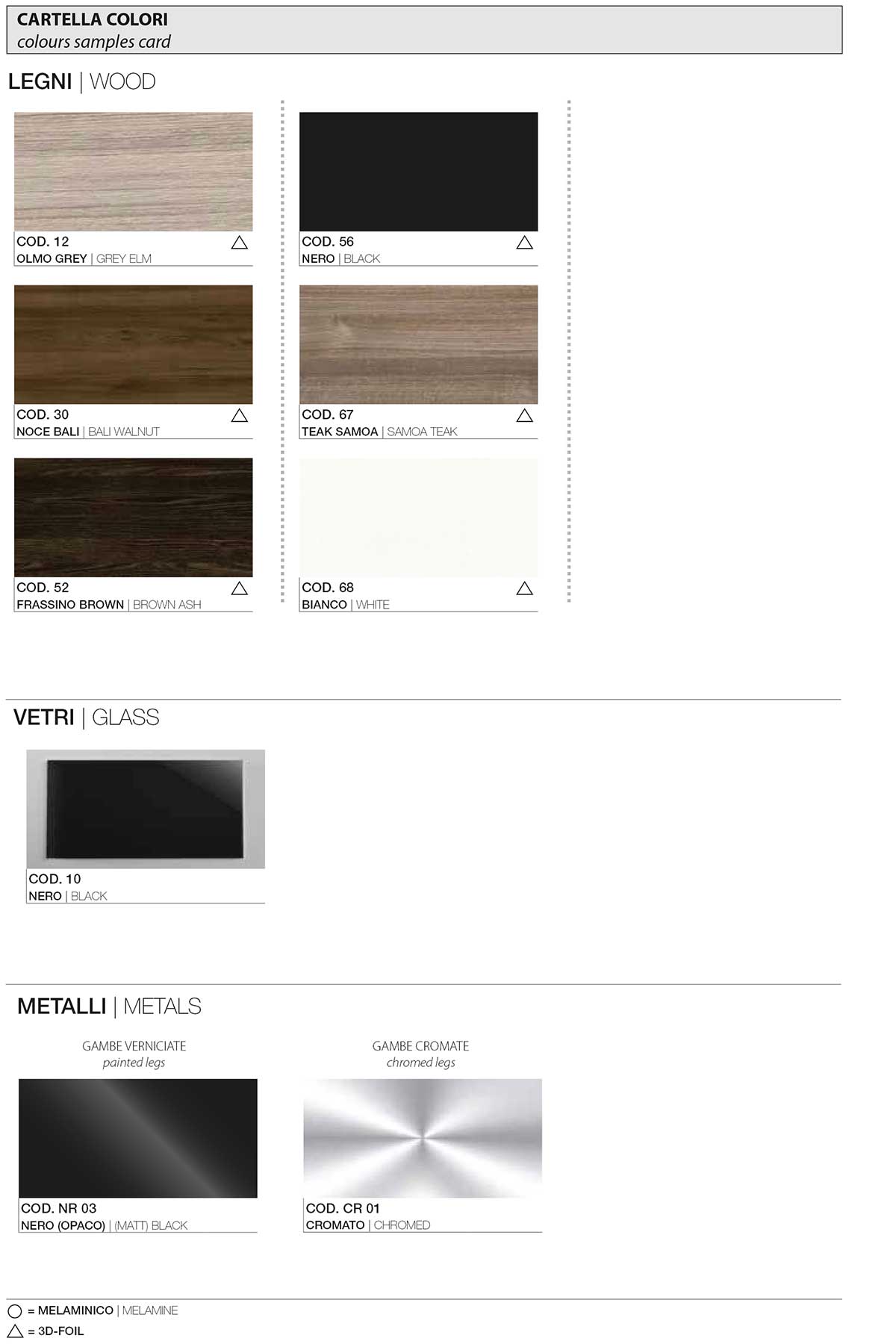 Il piano e l’inserto centrale sono in legno realizzati con panelli in MDF spessore 30 mm rivestiti con foglia polimerica (PVC) con angoli smussati.