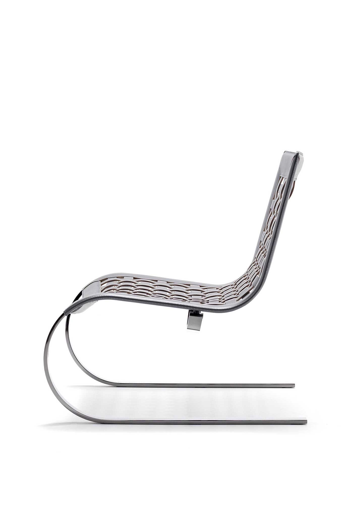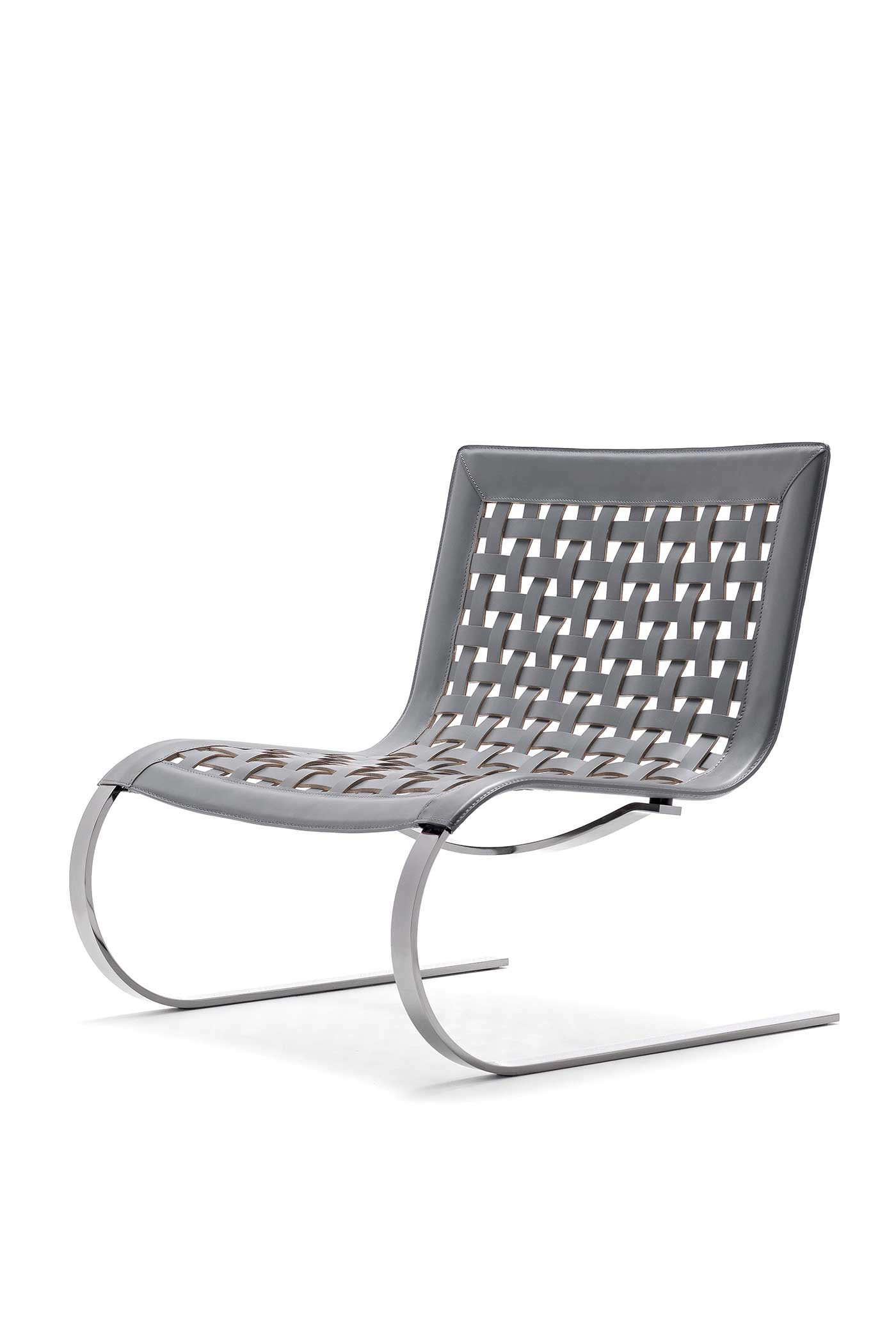 Design Giancarlo Vegni. Poltrona lounge in acciaio a trattamento galvanico e cuoio grigio. Base a slitta. Made in Italy, personalizzabile. Consegna gratuita