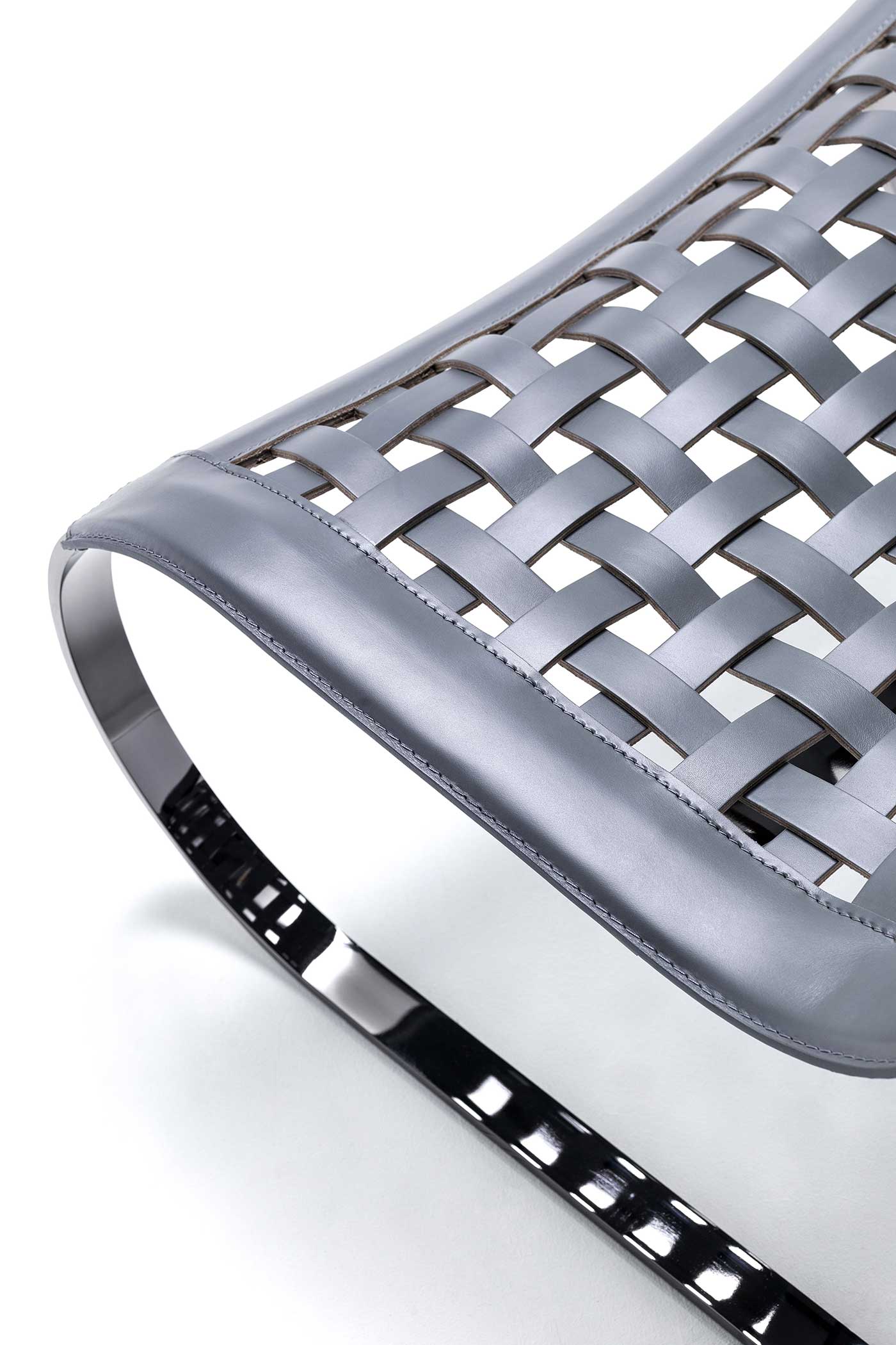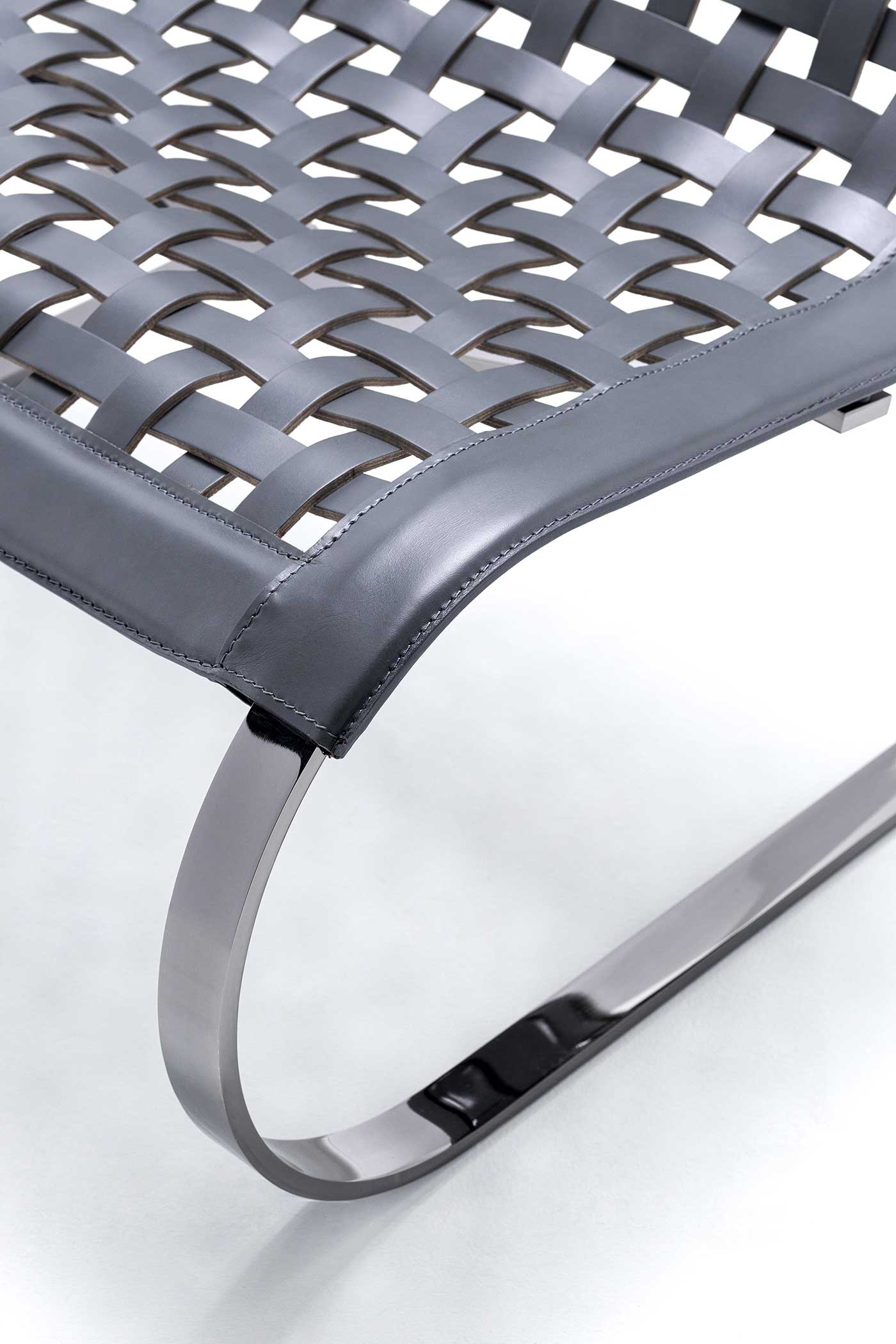 La poltrona nelle foto è realizzata con la struttura in finitura a trattamento galvanico “444 Nickel Nero” e con la seduta in cuoio colore “32 Grigio Argilla“.