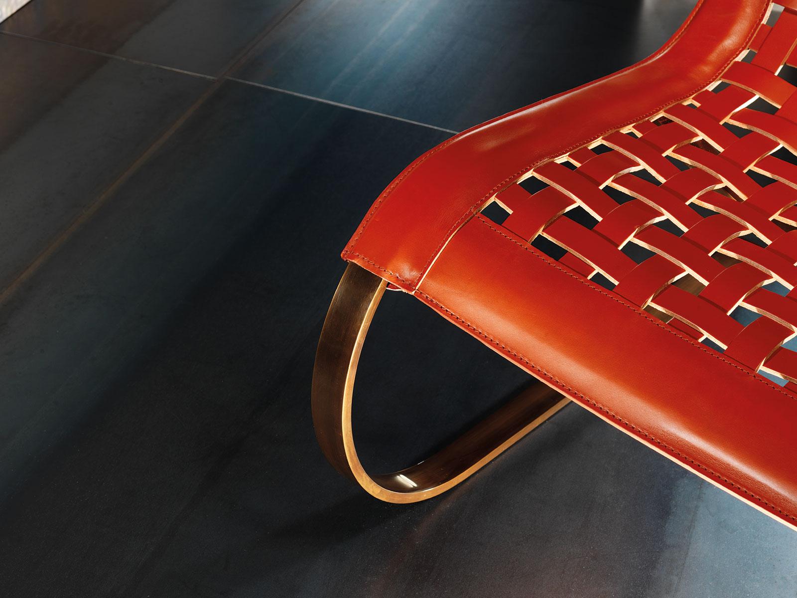 L’intreccio, nato dall’incrocio di fasce di cuoio cucite secondo la tradizione artigianale toscana, è di forte impatto visivo e offre sia allo sguardo che al tatto una netta sensazione di comfort.