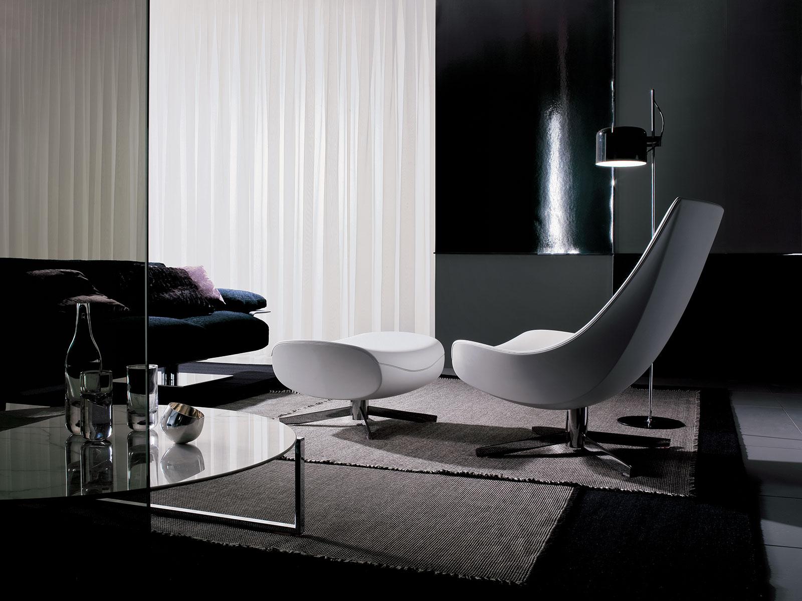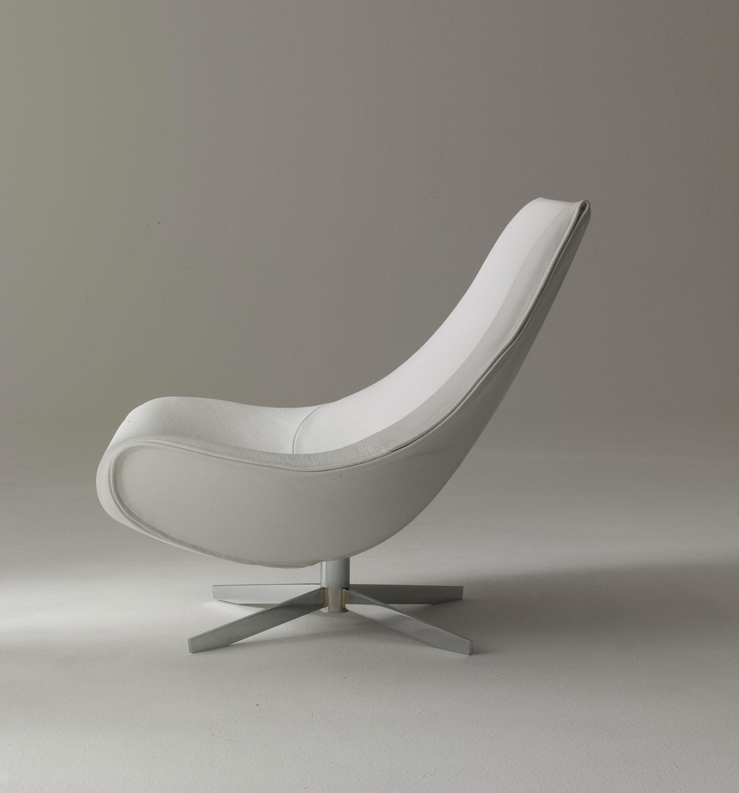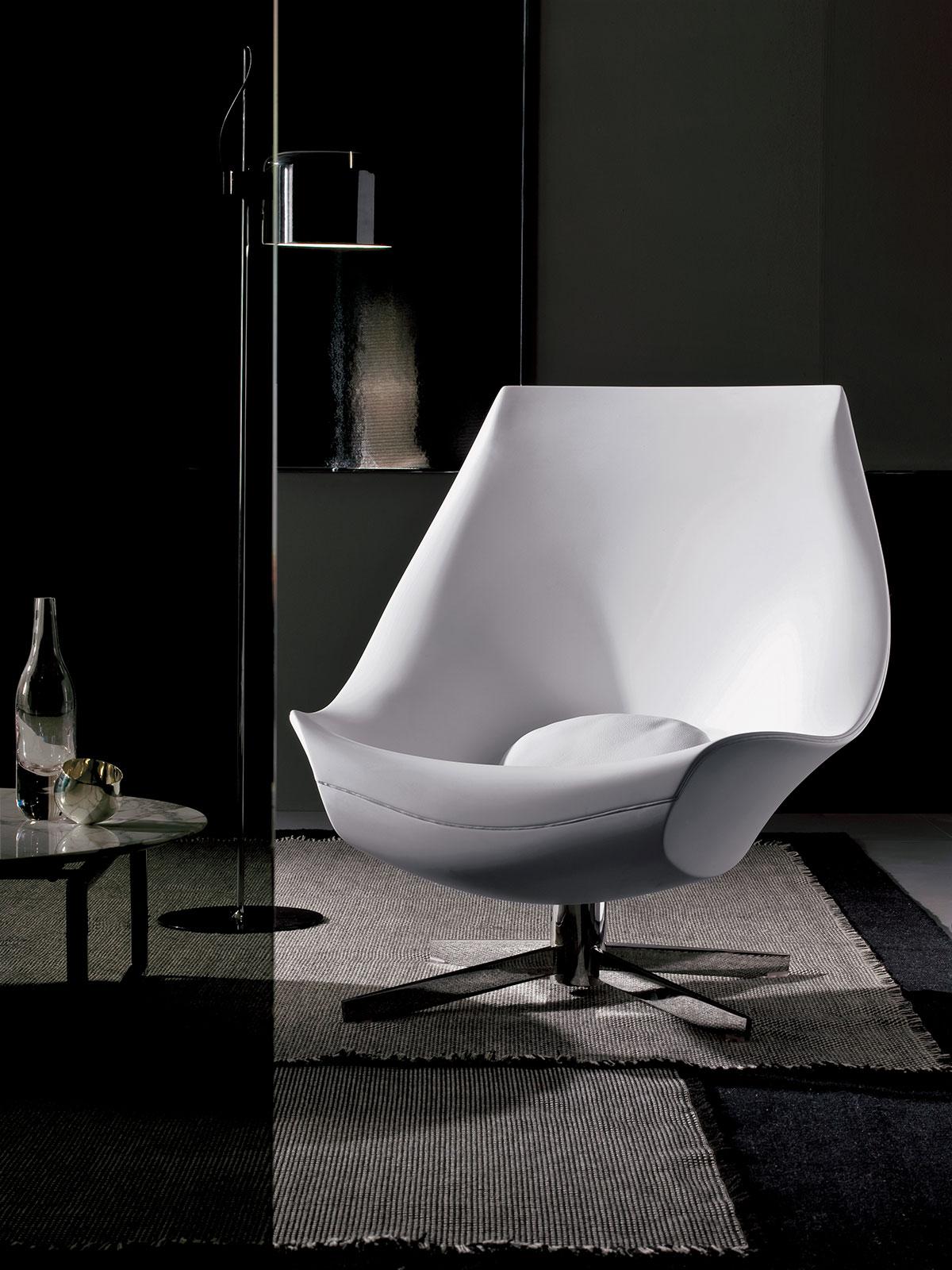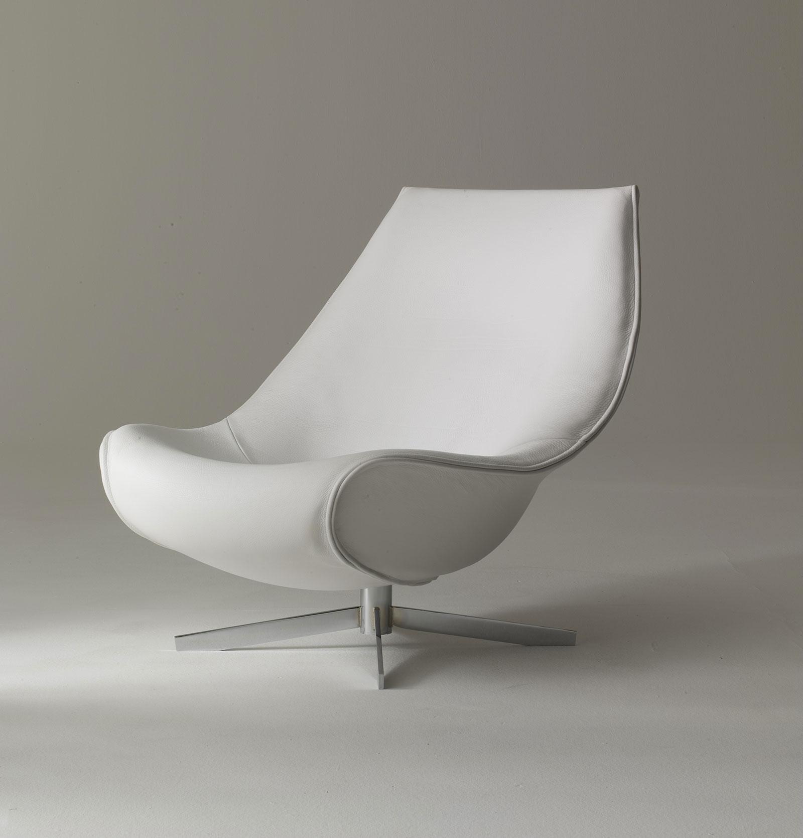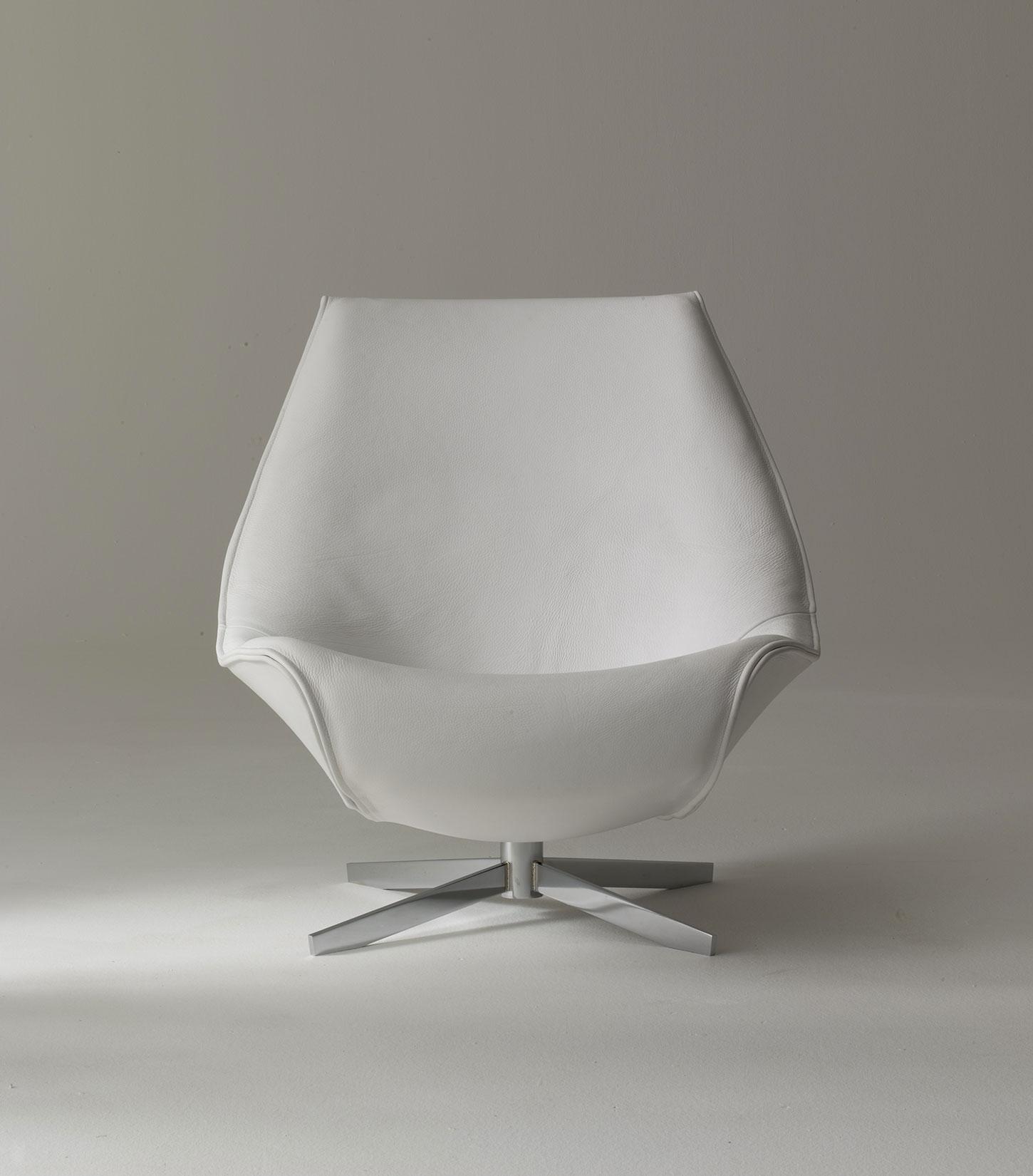 La poltrona poggia su di una solida struttura in acciaio, con meccanismo girevole e a quattro raggi. La base è cromata e può essere su richiesta laccata in 9 colori diversi: rosso rubino, rosso vino, blu zaffiro, grigio antracite, grigio agata, grigio ghiaia, bianco latte, marrone grigiastro o nero intenso lucido.