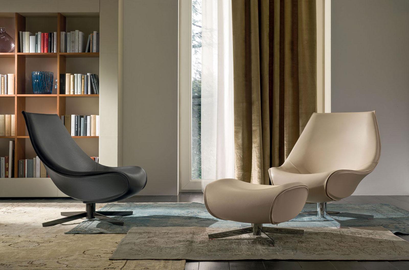 La poltrona può essere rivestita anche in pelle, disponibile in diverse qualità e colori e può essere personalizzata, ad esempio, in una versione bicolore.