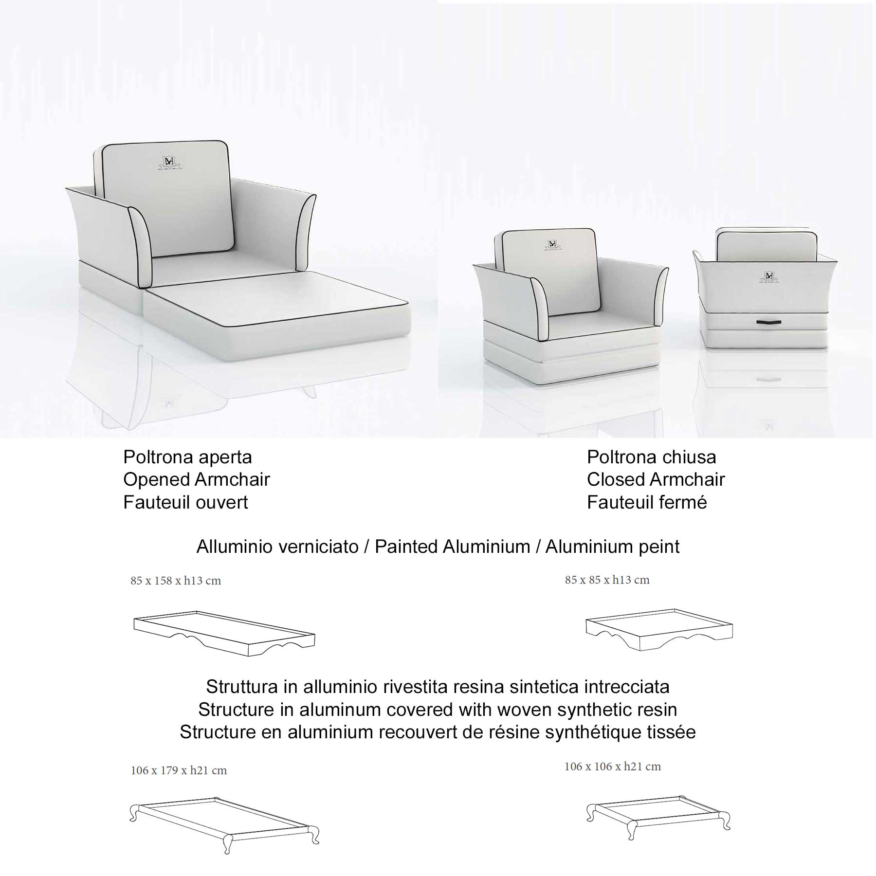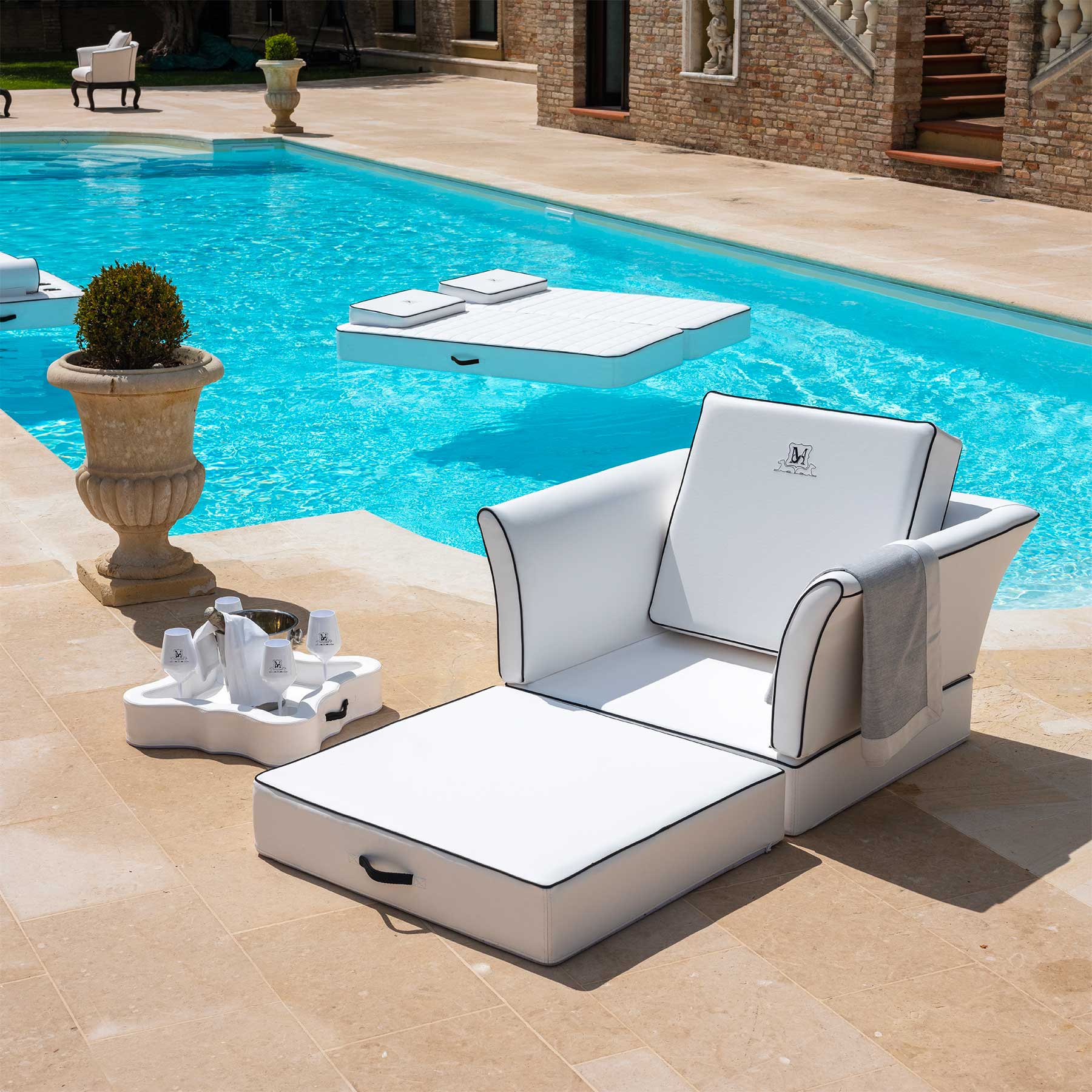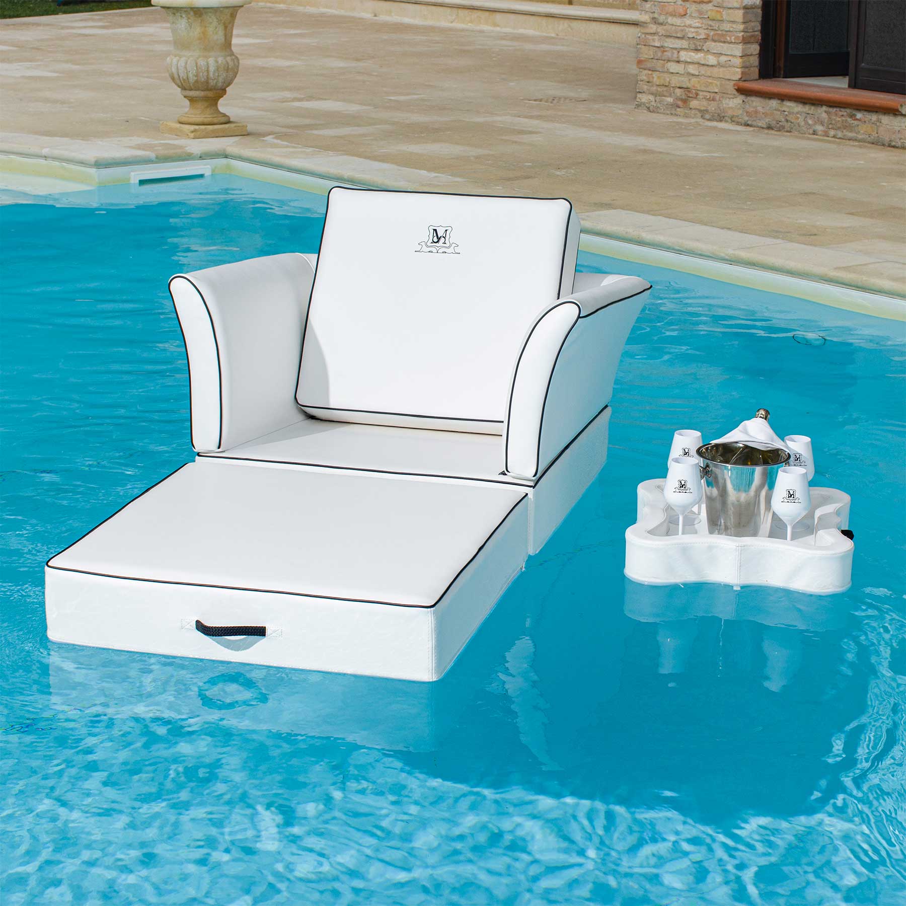 Su richiesta, ogni elemento della collezione è dotato di un’elegante base in alluminio su cui il cliente può appoggiarlo quando viene tirato fuori dall’acqua, in modo che lo stesso elemento può essere utilizzato anche per prendere il sole, diventando a tutti gli effetti un lettino o una comoda poltrona a bordo piscina.