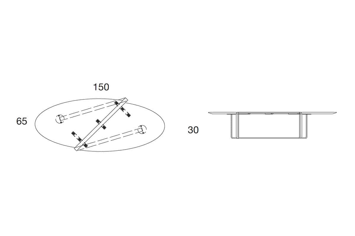 Le dimensioni del tavolino sono di cm. 150 x 65. L’altezza è di 30 cm.