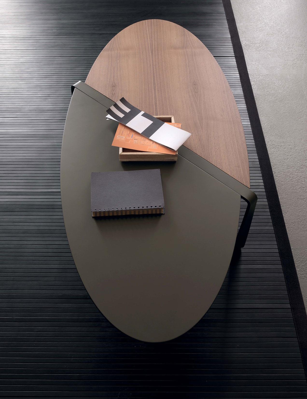 Il tavolino ovale ha il ripiano bicolore: bronzo metallizzato e impiallacciato noce Canaletto.
