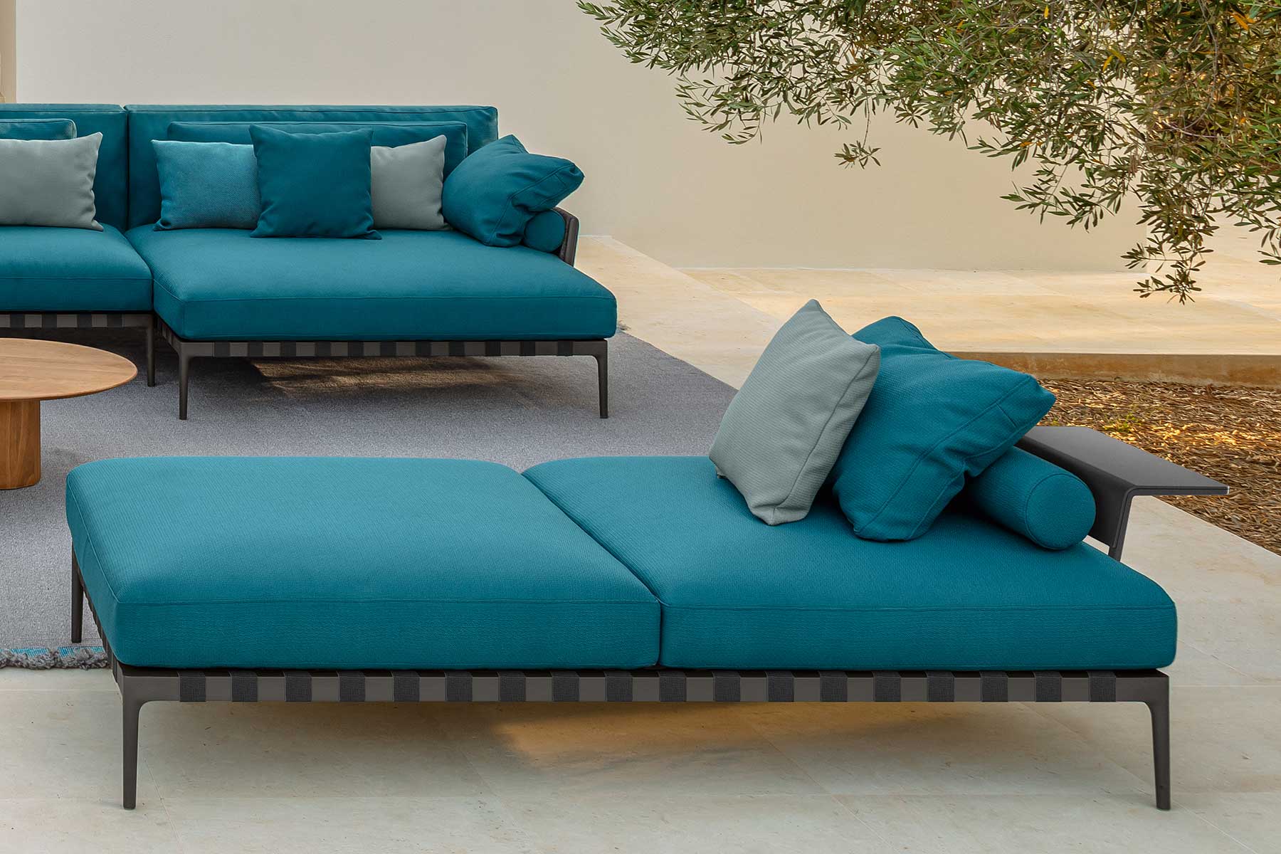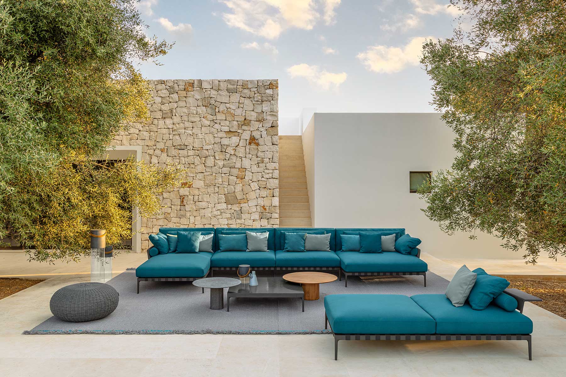 Vi proponiamo qui un esempio di salotto da giardino nella tonalità blu oceano, composto dagli elementi:
