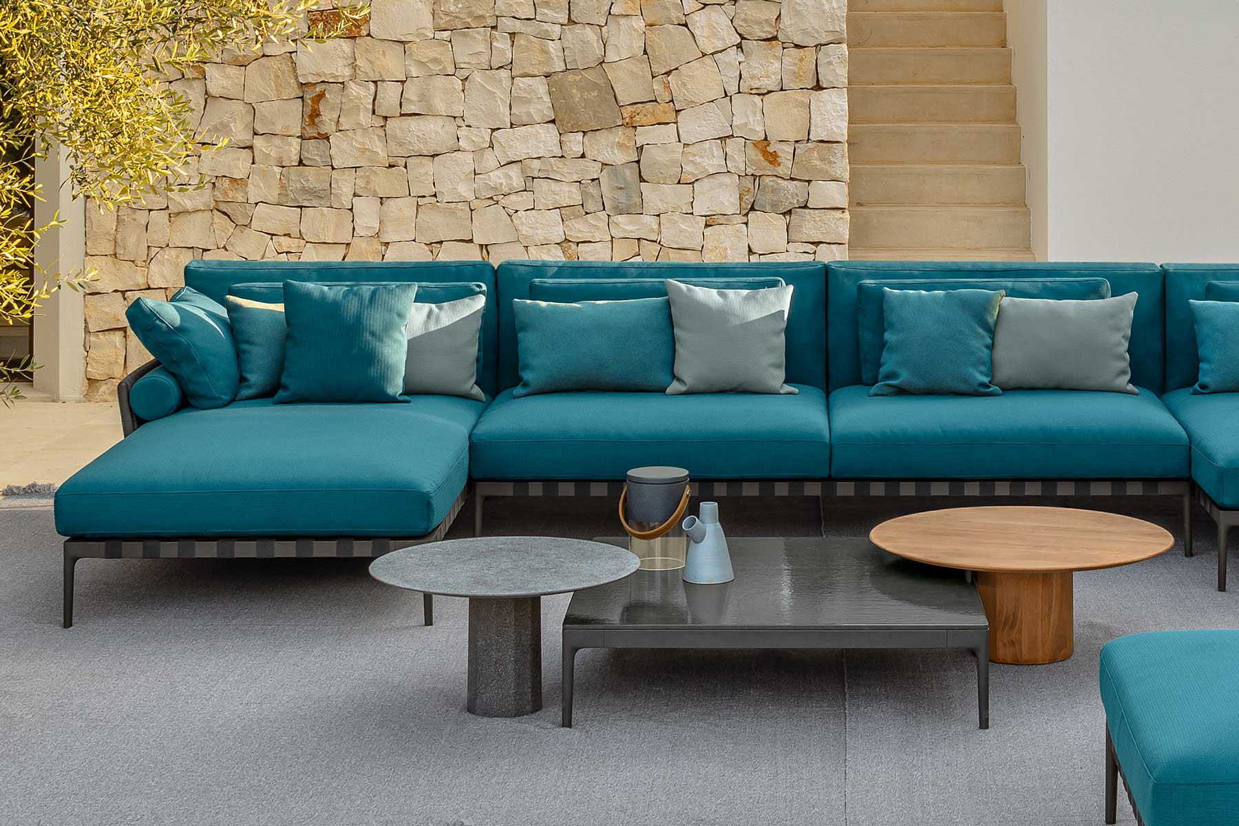 Tavolini, pouf, lampade e tappeti opzionali sono anch’essi disponibili in altre finiture.