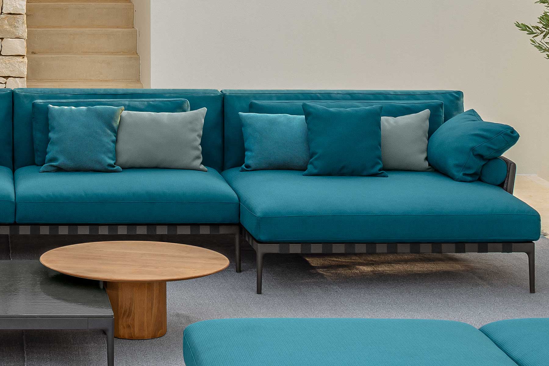 Divani lineari o componibili, poltrone, panche, pouf, tavoli quadrati, rotondi e rettangolari, tavolini, poltroncine per il tavolo da pranzo, cuscini decorativi abbinati.