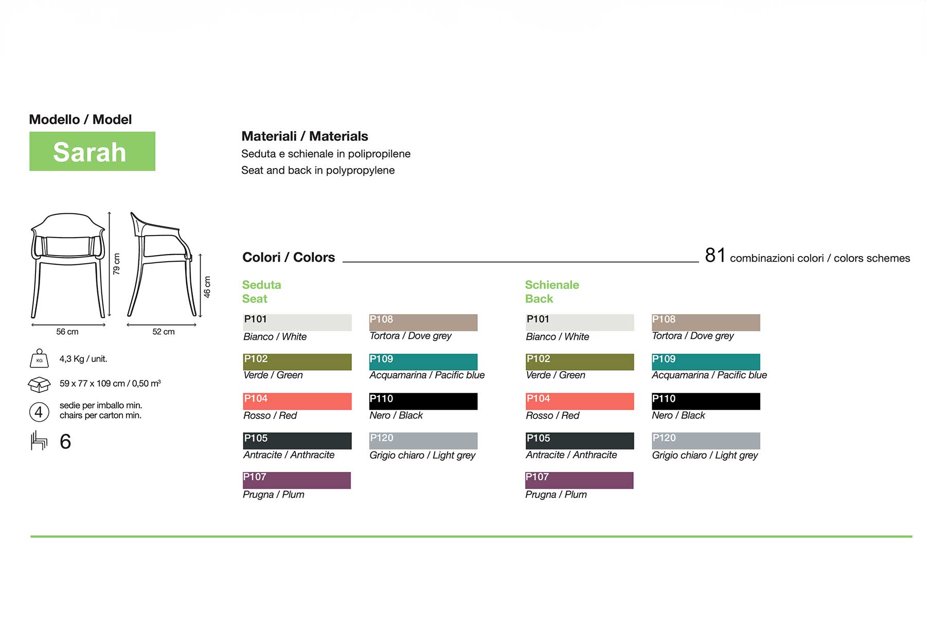 La poltroncina Sarah è vendibile da un minimo di 4 unità. I colori possono essere anche tutti diversi. Lo schienale può avere un colore diverso dal resto della struttura. Questa opportunità offre fino a 81 combinazioni di colore diverse per ciascuna poltroncina!