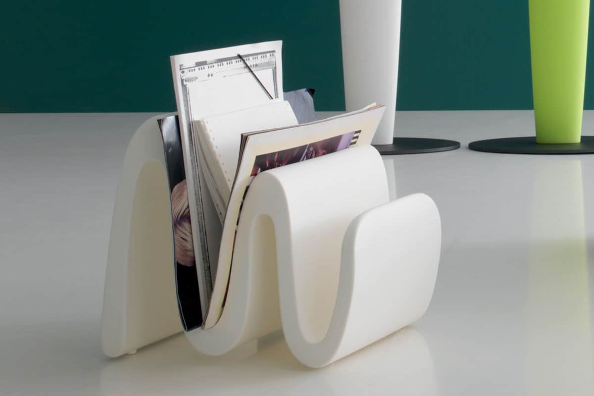 Il porta riviste in polietilene Sinuo è qui visibile in bianco.