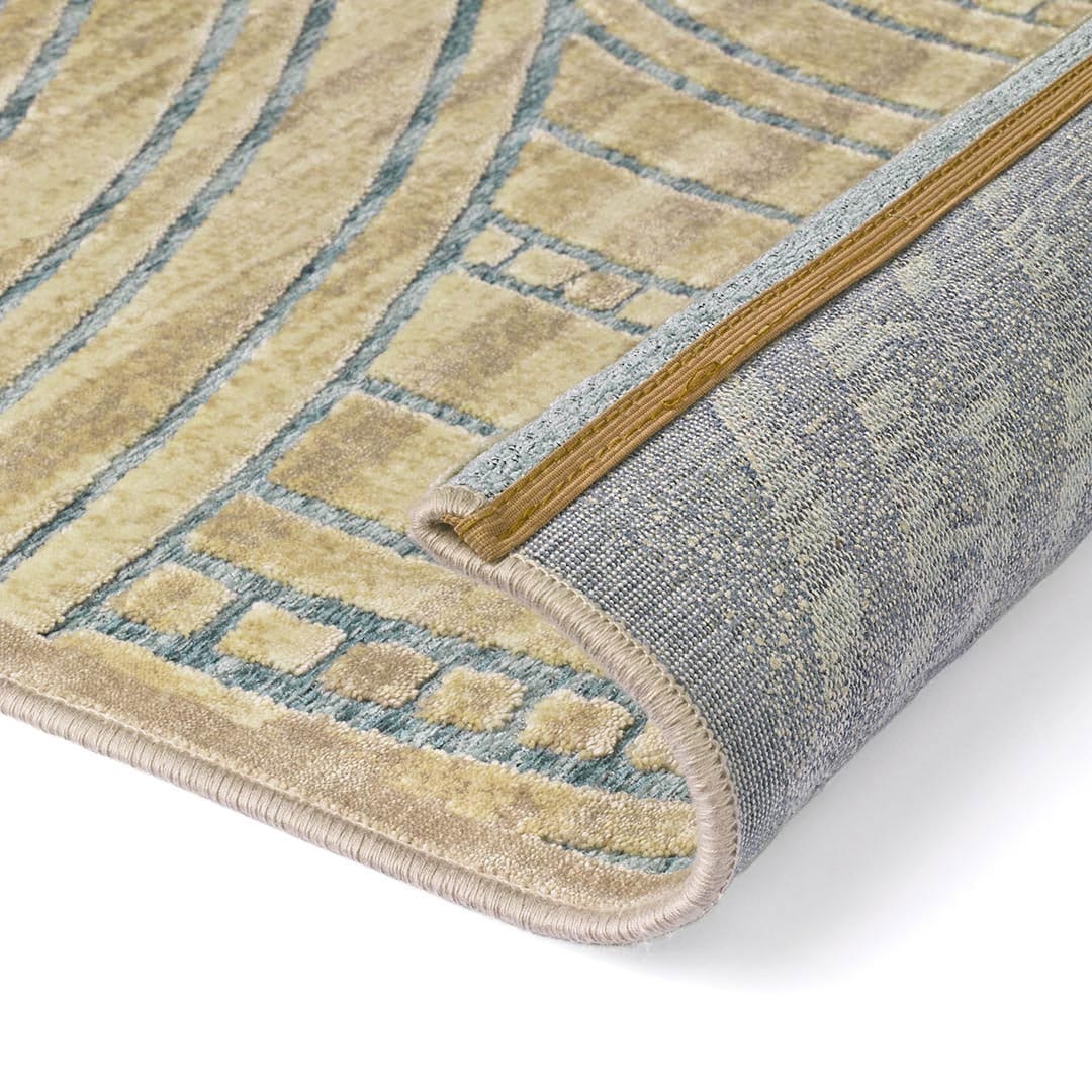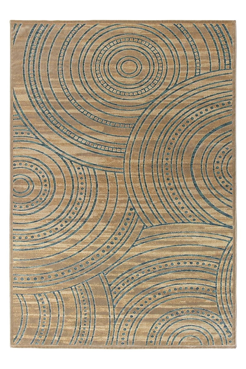 Il Tappeto rettangolare Gabrielle 1079B/Q41 Oro Turchese – cerchi concentrici sovrapposti stile Inca unisce design e matericità: cerchi concentrici sovrapposti stile Inca in oro e sfumature di turchese, per un risultato scenografico ma equilibrato, ideale per living contemporanei e sale da pranzo di carattere.