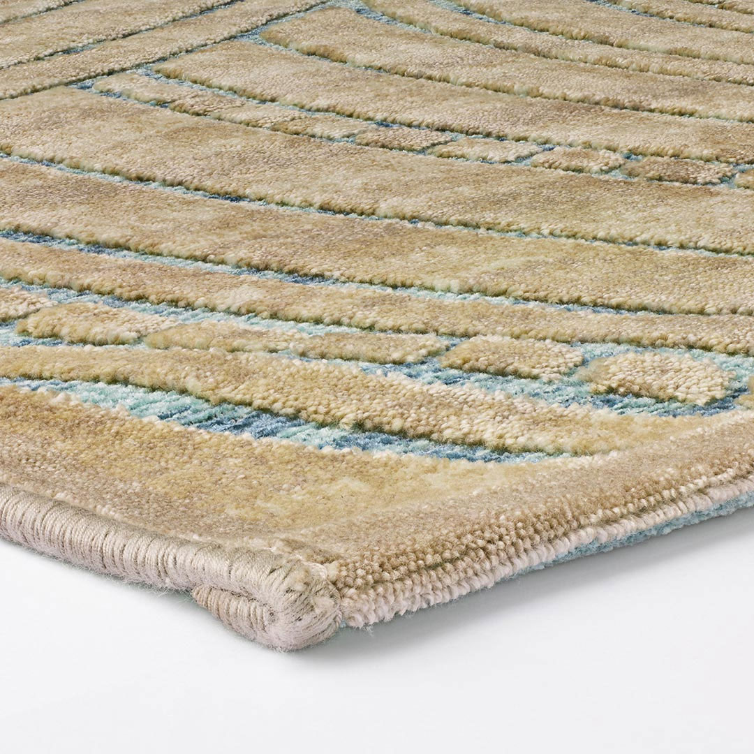 Materiali e struttura: 50% viscosa, 50% polipropilene. Altezza del vello 4 mm, spessore 7 mm, peso 1300 g/m². Tappeto tessuto su telaio meccanico. La viscosa regala mano setosa e riflessi eleganti; il polipropilene garantisce stabilità, resistenza all’uso e facilità di manutenzione.