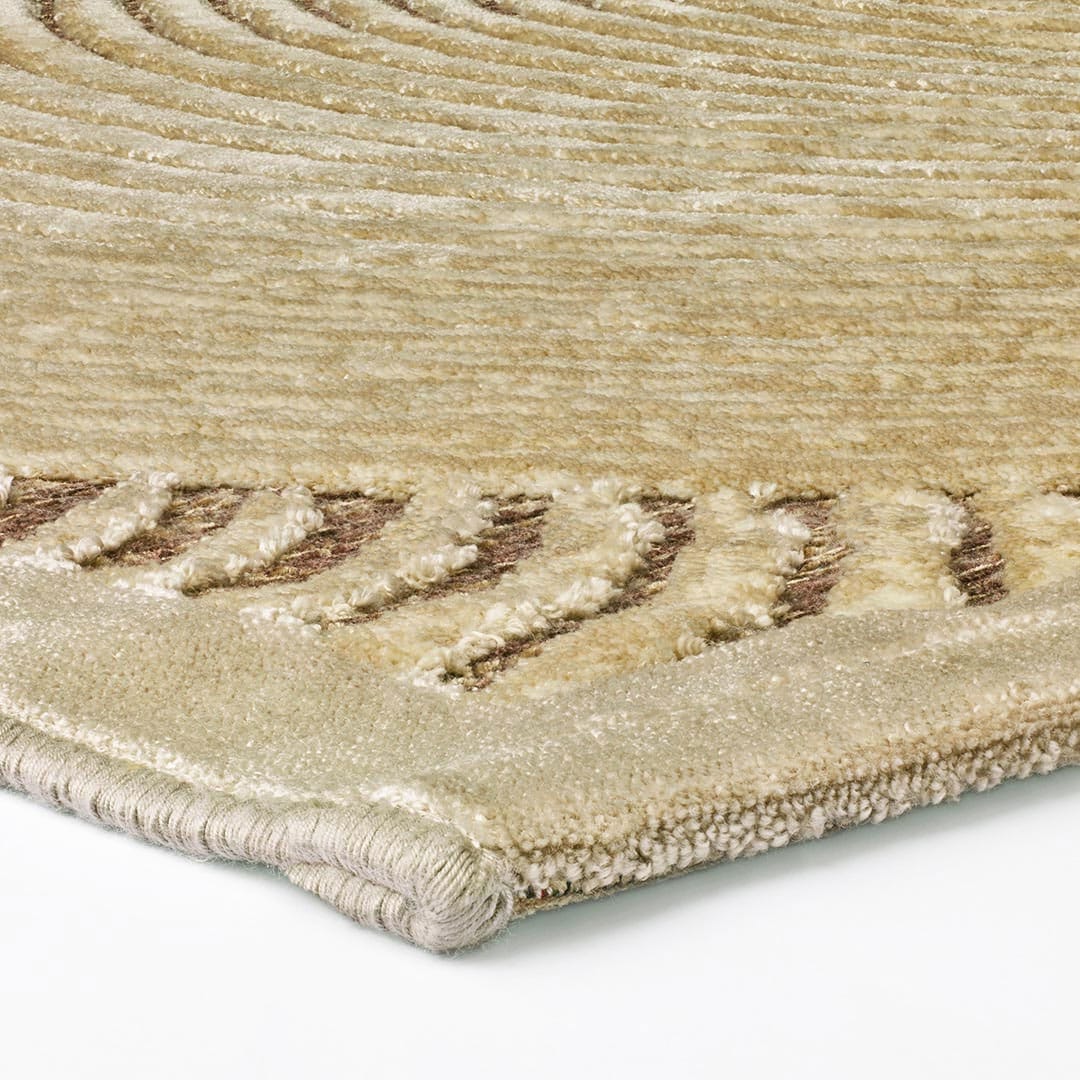 Tappeto rettangolare con cerchi concentrici sovrapposti in sfumature di giallo oro antico. 50% viscosa, 50% polipropilene.