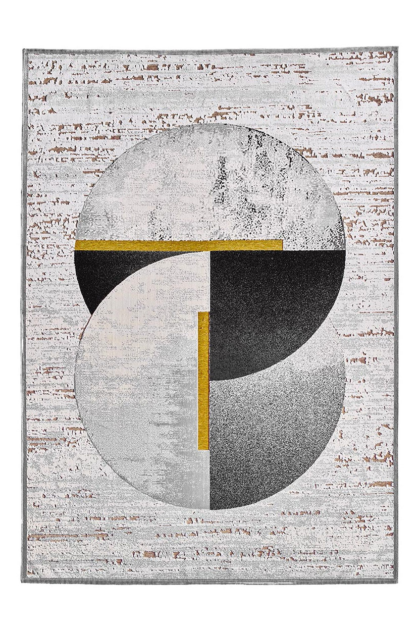 Il Tappeto rettangolare Gabrielle 858X/Q13 Grigio Nero Bianco/Oro – cerchi sovrapposti minimal unisce design e matericità: cerchi sovrapposti minimal in grigio, nero e bianco con dettagli dorati, per un risultato scenografico ma equilibrato, ideale per living contemporanei e sale da pranzo di carattere.
