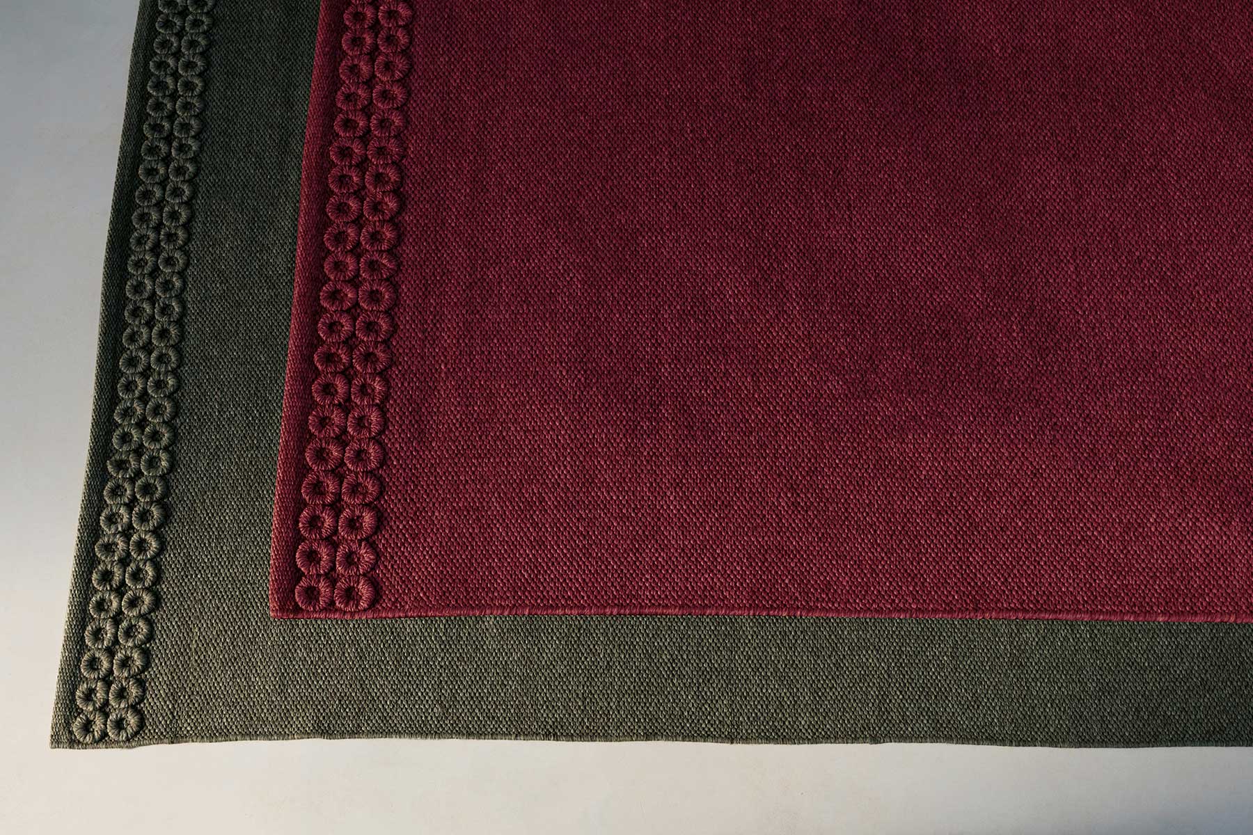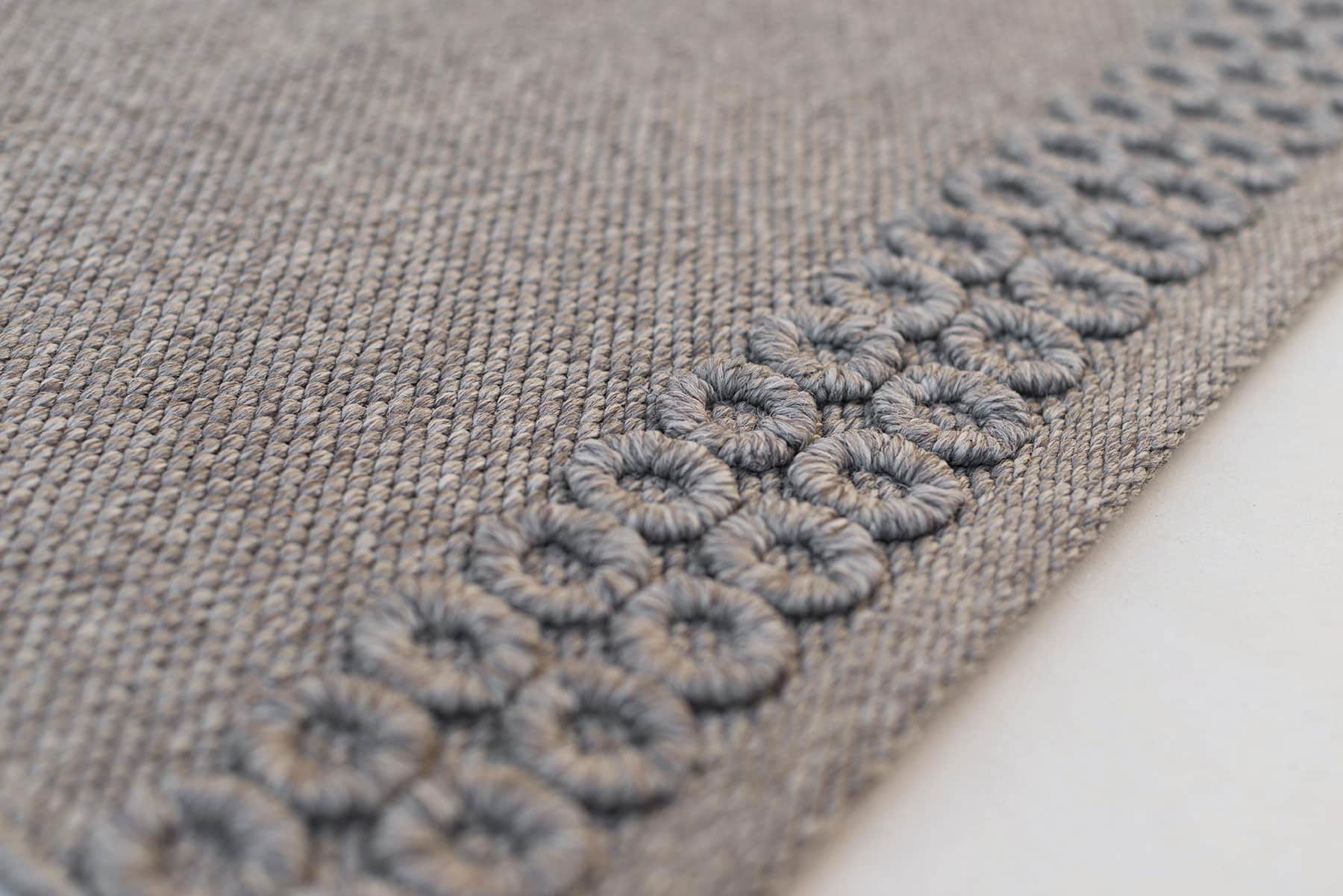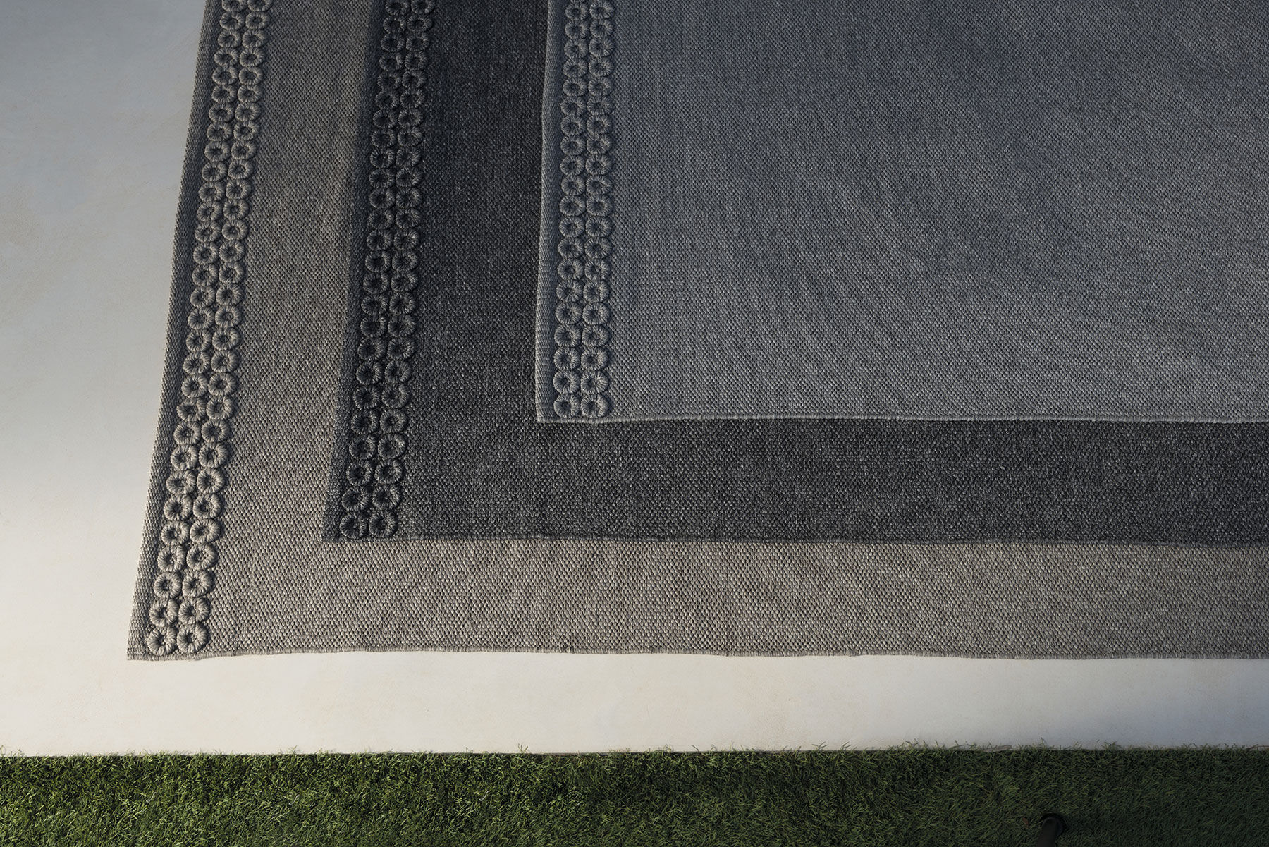 I tappeti Tondo sono realizzati in filato di fibra sintetica, hanno un trattamento idrorepellente, anti-macchia e anti-muffa.