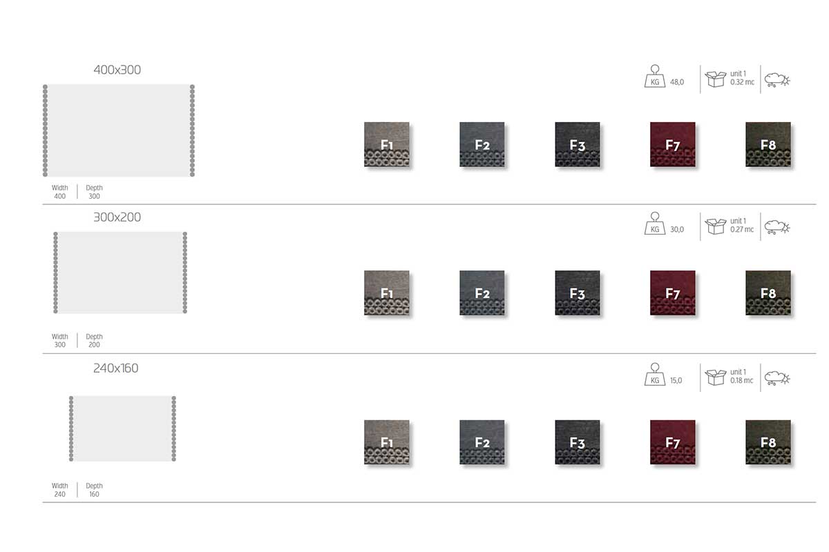I tappeti sono rettangolari e disponibili in 3 dimensioni: